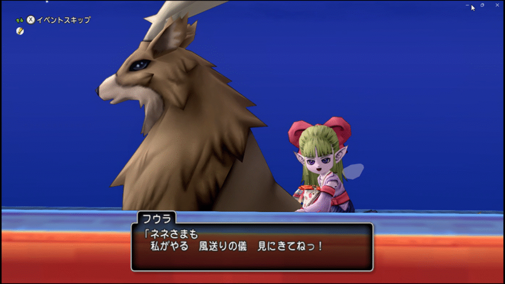 手綱をもらい、風のころもを手に入れ、カムシカと心をかわしたフウラちゃん。